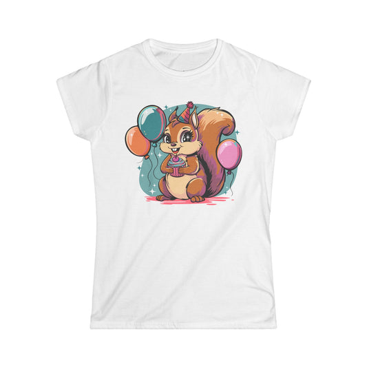 Happy Birthday Party Squirrel Women's T-shirt Squirrels Balloons Cupcake Short Sleeve Tee Celebration Ladies B-day Outfit Top