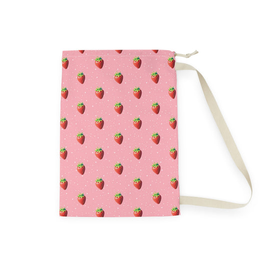 Pink Laundry Bag with Red Strawberries Pattern Design, Strawberry Laundry Bags with Drawstring