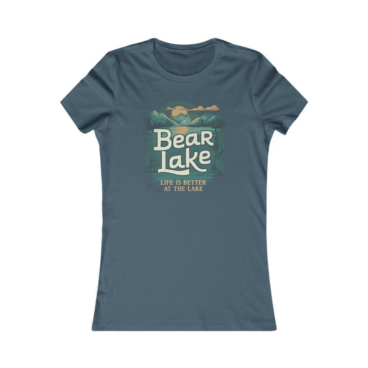 Bear Lake Summer Vacation Travel T-shirt Women's Favorite Fitted Cotton Tee with Scenic Mountain Lake View Short Sleeve Shirts