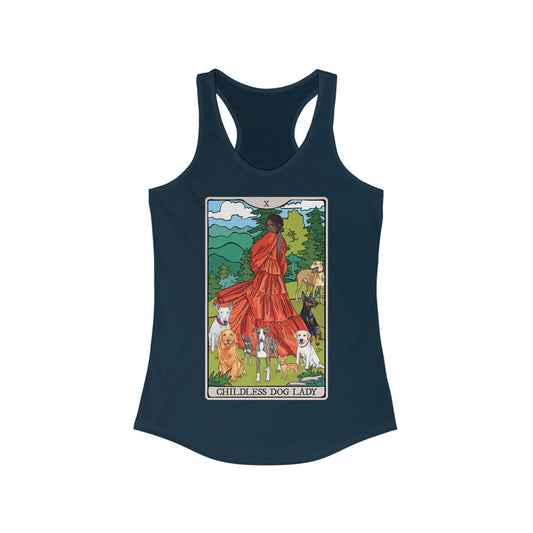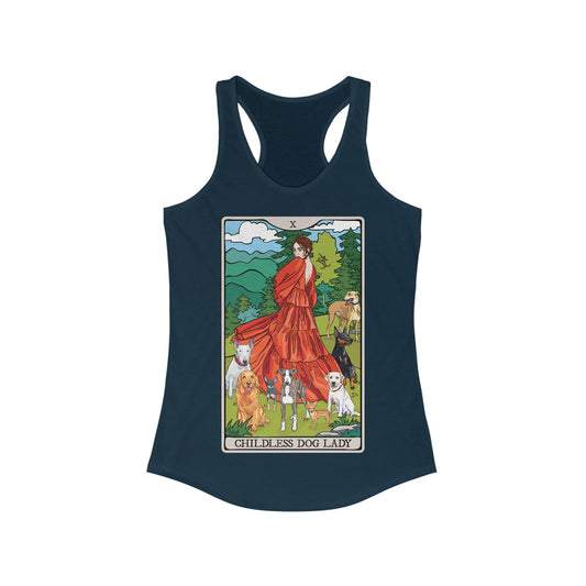 Childless Dog Lady Tarot Card Women's Racerback Tank Top Child-Free Dog Mom Shirt with Woman and Dogs Design