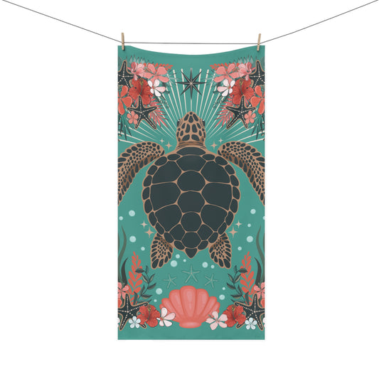 Sea Turtle Beach Towel, Tropical Floral Ocean Design Bath Towels Pool Accessories, Marine Life Turtles Seashell Print
