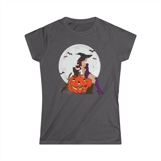 Pinup Witch Halloween Women's T-shirtJack-O-Lantern Pumpkin Ladies Soft Cotton Fitted Witchy Goth Tee, Fall Apparel