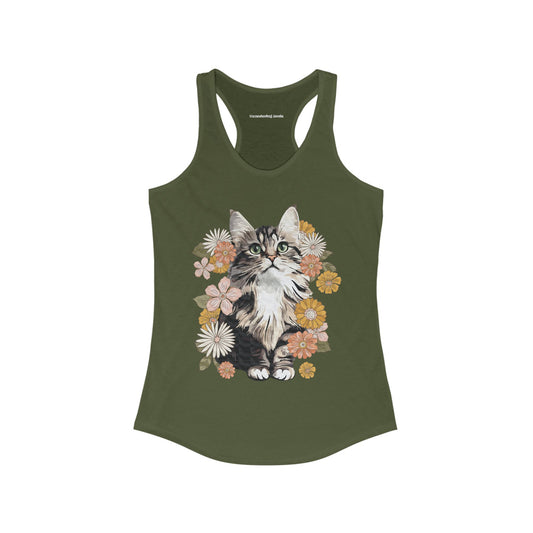 Moonchi Fluffy Kitty In Flowers Women's Racerback Tank Top Floral Cat Sleeveless Shirt Nature Apparel Tops