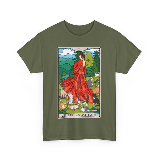 Childless Cat Lady Tarot Card Cotton T-shirt Child-Free Cat Mom Tee with Woman and Cats Design Cotton Shirts