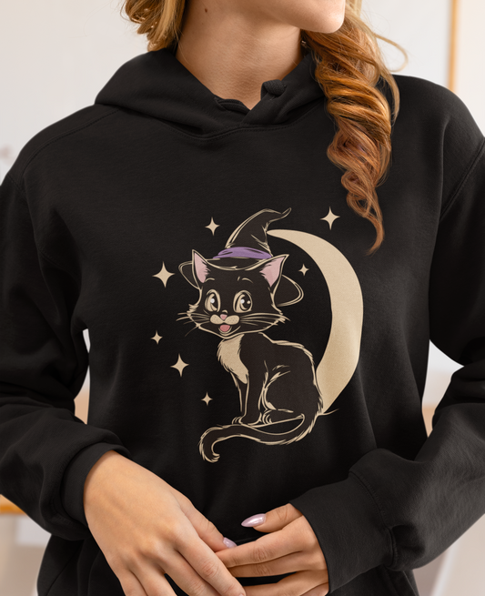 Witchy Kitty Pullover Hoodie Halloween Hooded Sweatshirt with Black Cat with Witch Hat & Crescent Moon Print