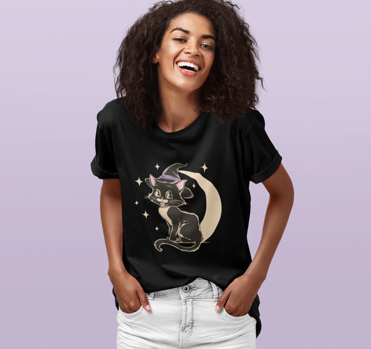 Witchy Kitty Cotton T-Shirt - Black Cat Halloween Graphic Tee with Retro Kitten and Witch Hat with Spooky Crescent Moon Print