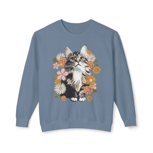 Moonchi Fluffy Kitty In Flowers Lightweight Crewneck Sweatshirt Long Sleeve Floral Cat Sweater 100% Ringspun Cotton Nature Sweatshirts
