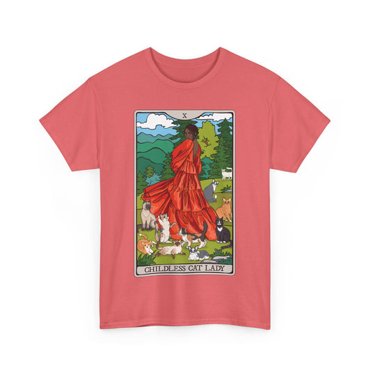 Childless Cat Lady Tarot Card Cotton T-shirt Child-Free Cat Mom Tee with Woman and Cats Design = POC Darker Skin Tone