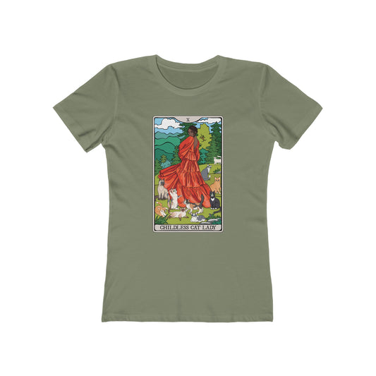 Childless Cat Lady Tarot Card Women's Fitted T-shirt Child-Free Cat Mom Tee with Woman and Cats Design