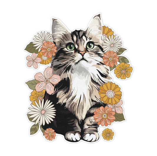 Moonchi Fluffy Kitty In Flowers Sticker - Waterproof, Fade-Resistant Decal Stickers Floral Cat Design
