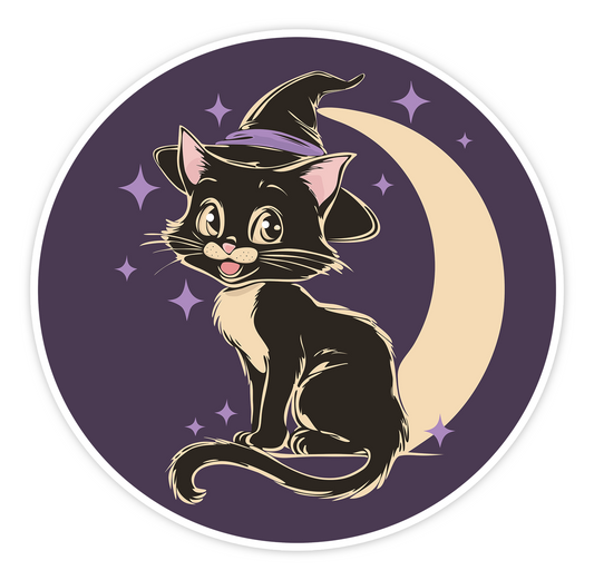 Witchy Kitty Sticker - 3" Waterproof, Fade-Resistant Decal Stickers Halloween Witch Cat & Moon