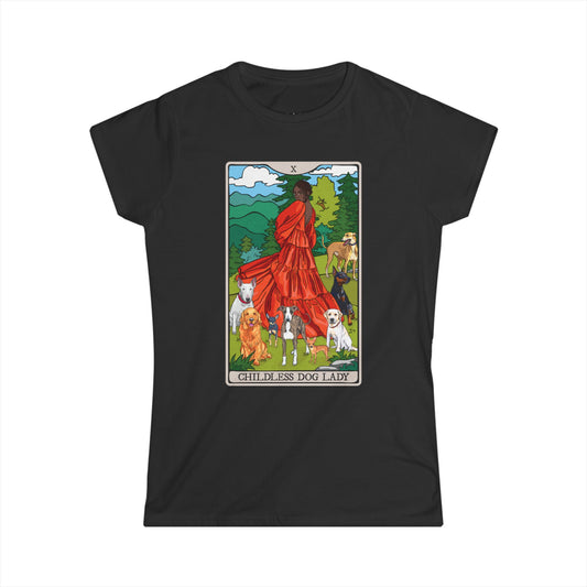 Childless Dog Lady Tarot Card Women's Fitted T-shirt Child-Free Dog Mom Tee with Woman and Dogs Design