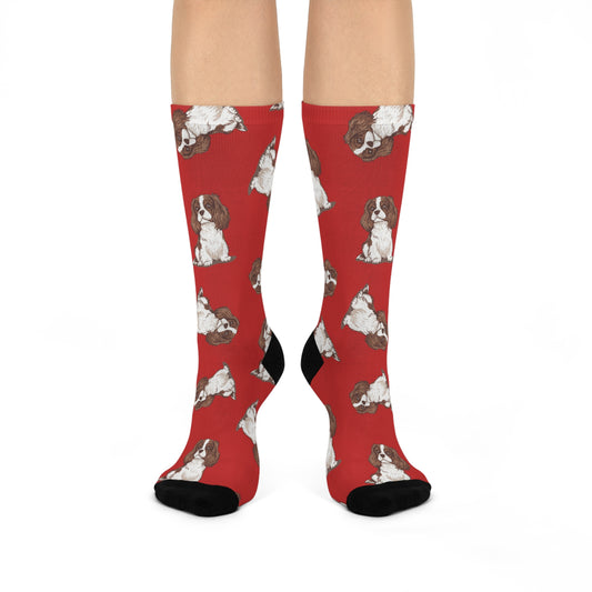 Blenheim Cavalier King Charles Spaniel Dog Pattern Red Cushioned Crew Socks with Pet Dogs Cavaliers Puppy Print
