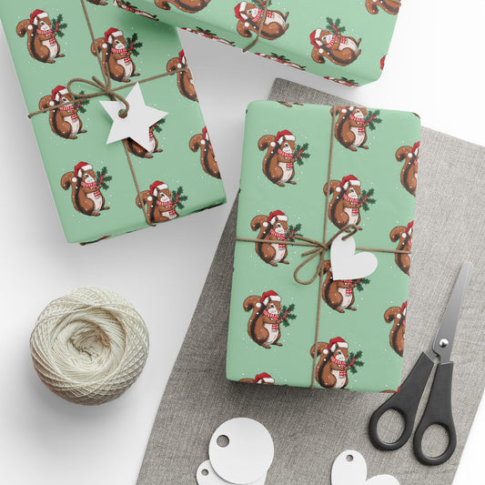 Squirrel Christmas Wrapping Paper, Festive Squirrels Print, Cheery Sage Green Holiday Gift Wrap With Snowy Xmas Squirrel In Santa Hat