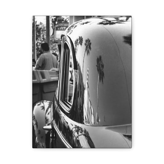 Vintage Car with Palm Tree Reflections Matte Stretched Canvas Art Photography Print, Florida Black & White Photography Wall Art 1.25"