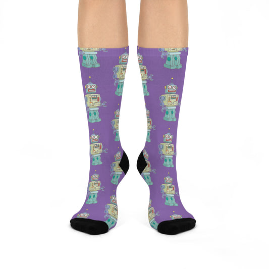 Robot Purple Cushioned Crew Socks with Robot Design Mens Womens Socks