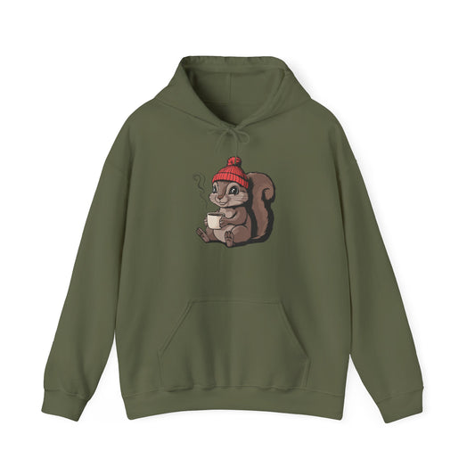 Cozy Squirrel Pullover Hoodie Unisex Heavy Blend Hooded Sweatshirt with Squirrel in Beanie with Cup Of Coffee Graphic Print