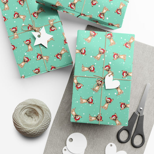 Chihuahua Dog Christmas Wrapping Paper, Puppy Dogs Print, Cheery Mint Green Holiday Gift Wrap With Snowy Xmas Puppies In Santa Hat