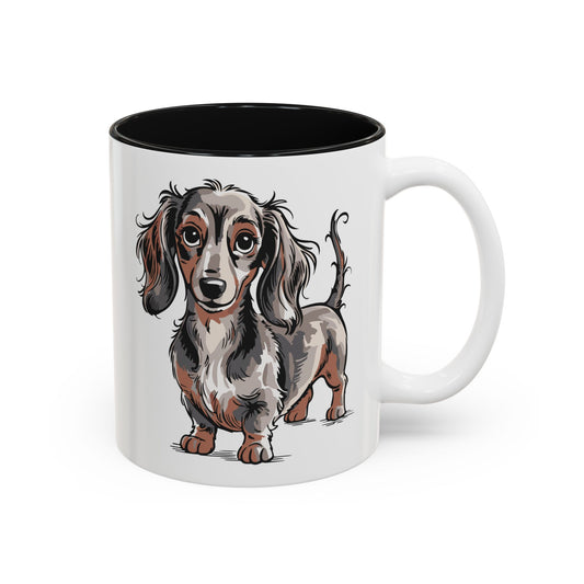 Longhaired Dachshund Dog Illustration Mug | 11 oz Two-Tone Black Accent Ceramic Coffee Mugs, Wiener Dogs Design