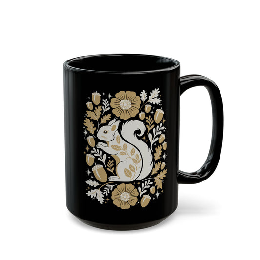 Floral Folk Art Squirrel Mug | 15 Oz Black Ceramic Coffee Cup Woodland Squirrels with Acorns, Leaves, & Flowers, Nature Mugs