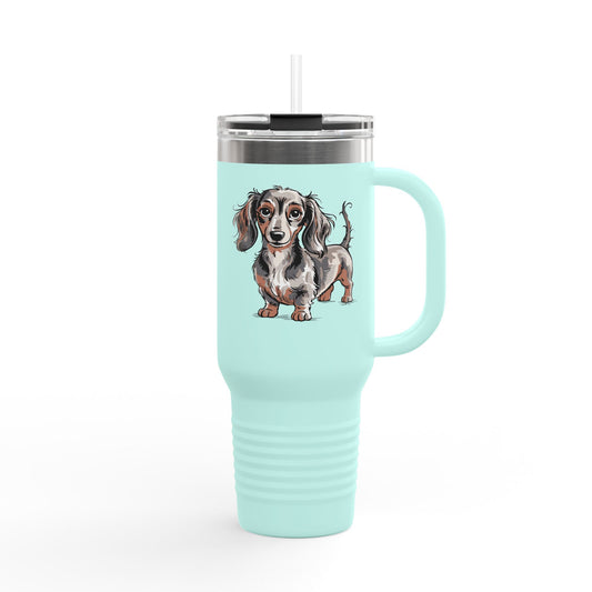 Long Haired Dachshund Dogs Illustration 40oz Travel Mug | Insulated Tumbler Water Bottle with Cute Wiener Dog Artwork