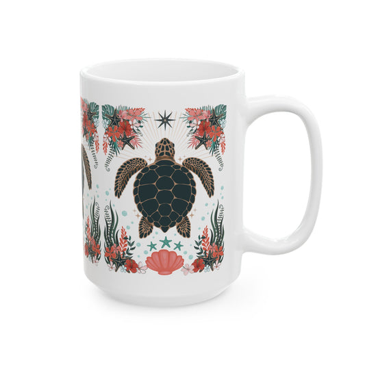 Tropical Sea Turtle Illustration Mug | Hawaiian Floral Marine Life Ceramic Coffee Mugs 15oz, Starfish, Coral, Shells, Flowers