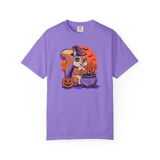 Witchy Squirrel T-shirt, Halloween Witch Squirrels Pumpkin Cauldron & Bats, Spooky Magical Short Sleeve Tee Mens Womens Top