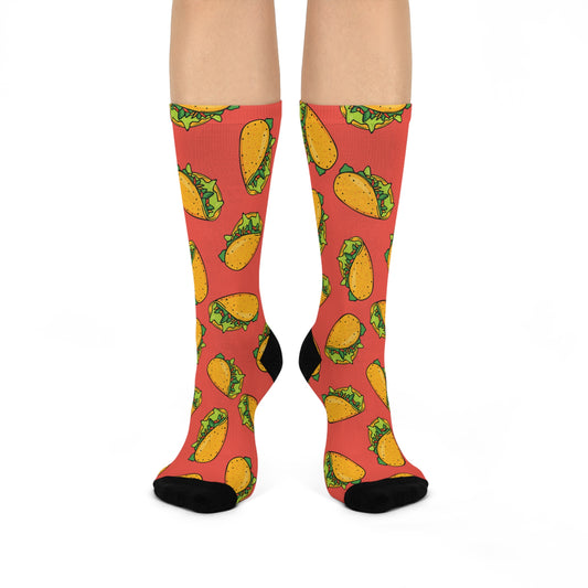 Taco Cushioned Crew Socks, Fun Novelty Tacos Pattern Design, Funny Mexican Food Socks