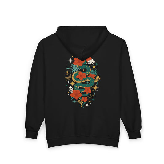Mystic Gold Snake Black Zip Up Hoodie - Full Zip Hooded Sweatshirt Jacket, Boho Floral Serpent Design Zipper Hoodies Mens Womens Sweatshirts