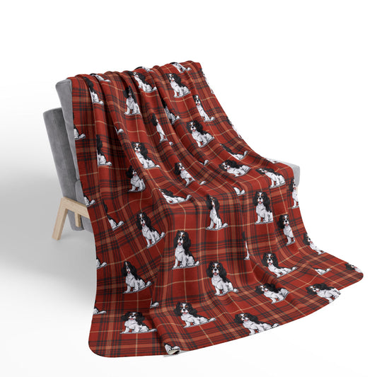 Tricolor Cavalier King Charles Spaniel Red Plaid Fleece Sherpa Blanket, Dogs Pattern Throw Blankets Bedding