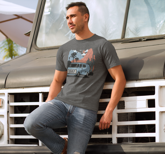 Arizona Desert Vanlife Camper Van Cotton T-shirt - Short Sleeve Tee Retro Van in Joshua Tree & Cactus Landscape