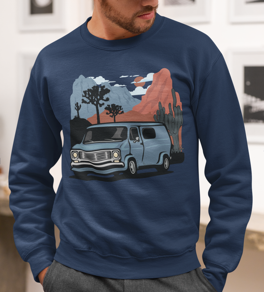 Arizona Desert Vanlife Camper Van Sweatshirt - Long Sleeve Crew Neck Sweater Retro Van in Joshua Tree & Cactus Landscape