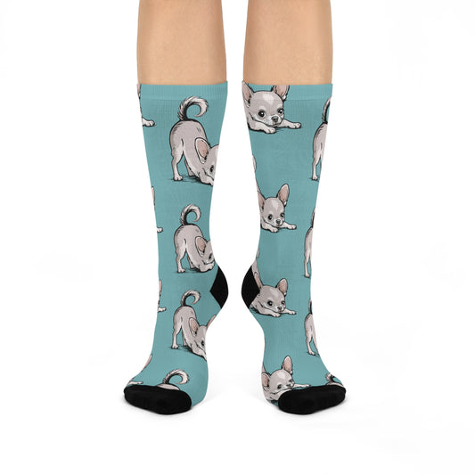 Playful Chihuahua Puppy Dogs Pattern Cushioned Crew Socks | Teal Dog Print Cute Noverlty Footwear Accessories