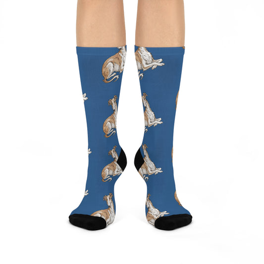 Borzoi Dogs Pattern Cushioned Crew Socks, Blue Russian Hunting Sighthound Dog Print, Novelty Footwear Pet Owners