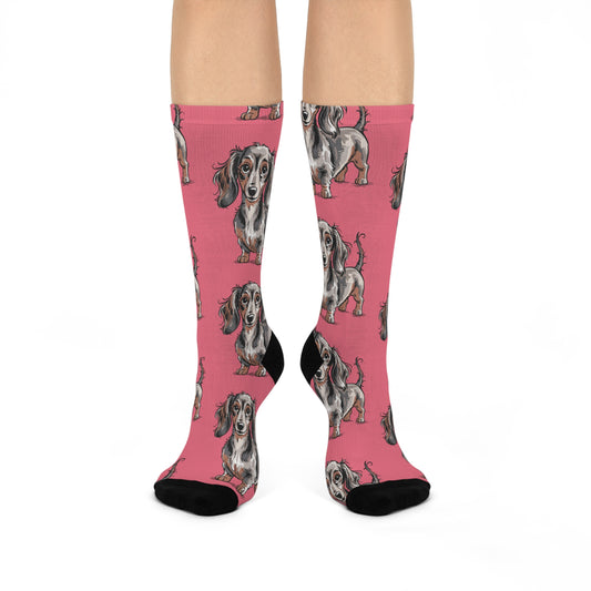 Long Haired Dachshund Pattern Cushioned Crew Socks | Wiener Dog Illustration, Pink Novelty Puppy Socks