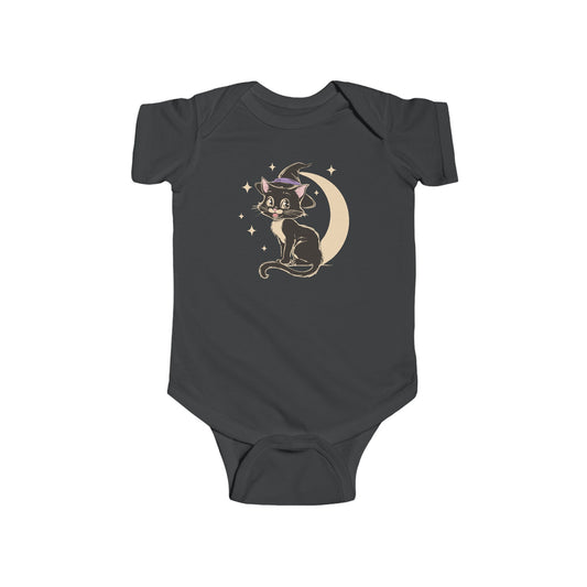 Witchy Kitty Baby One Piece Infant Cotton Bodysuit with Halloween Black Cat with Witch Hat & Moon Print
