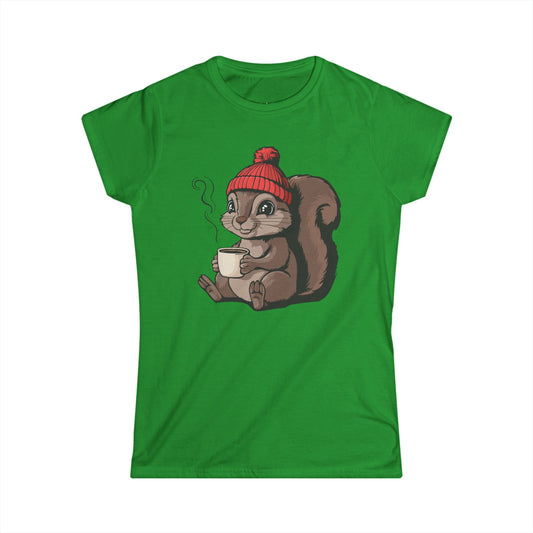 Cozy Squirrel Women's Soft T-shirt Softstyle Tee with Squirrel in Beanie with Cup Of Coffee Graphic Print