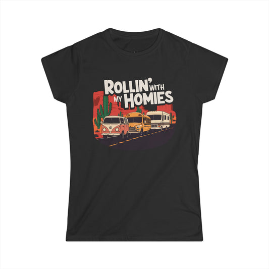 Rollin' With My Homies Van Skoolie RV Vanlife Caravan in the Desert Soft Fitted T-shirt Women's Soft Tee