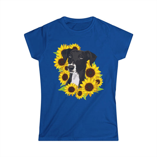 Marley Dog in Sunflowers Women's Softstyle T-shirt - Cotton Tee with Black Lab Dog with Sunflower Art Print