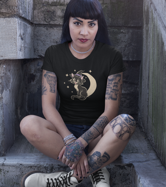 Witchy Kitty Women's Soft CottonT-shirt - Black Cat Halloween Graphic Tee with Kitten Witch Hat & Spooky Crescent Moon Print