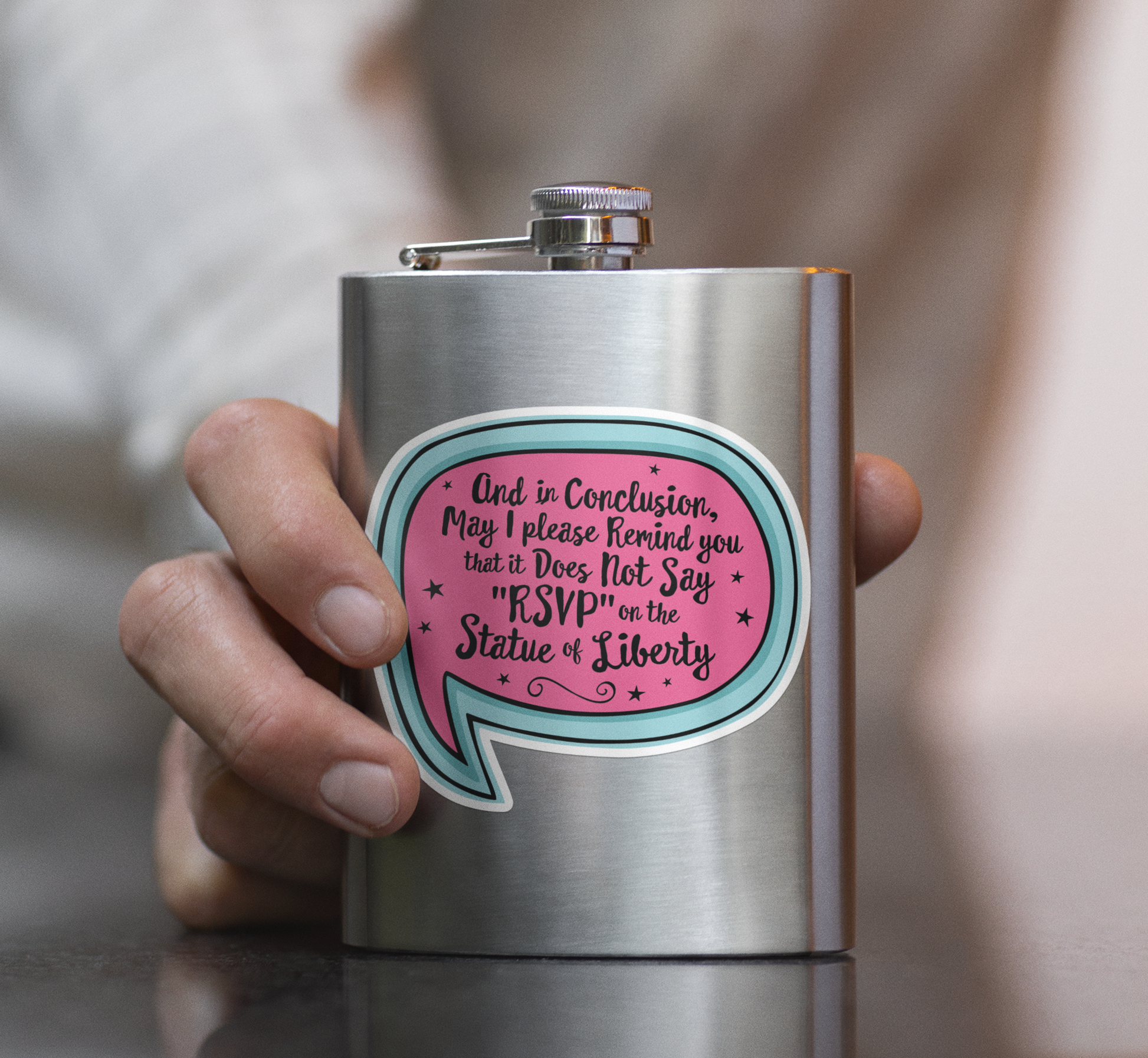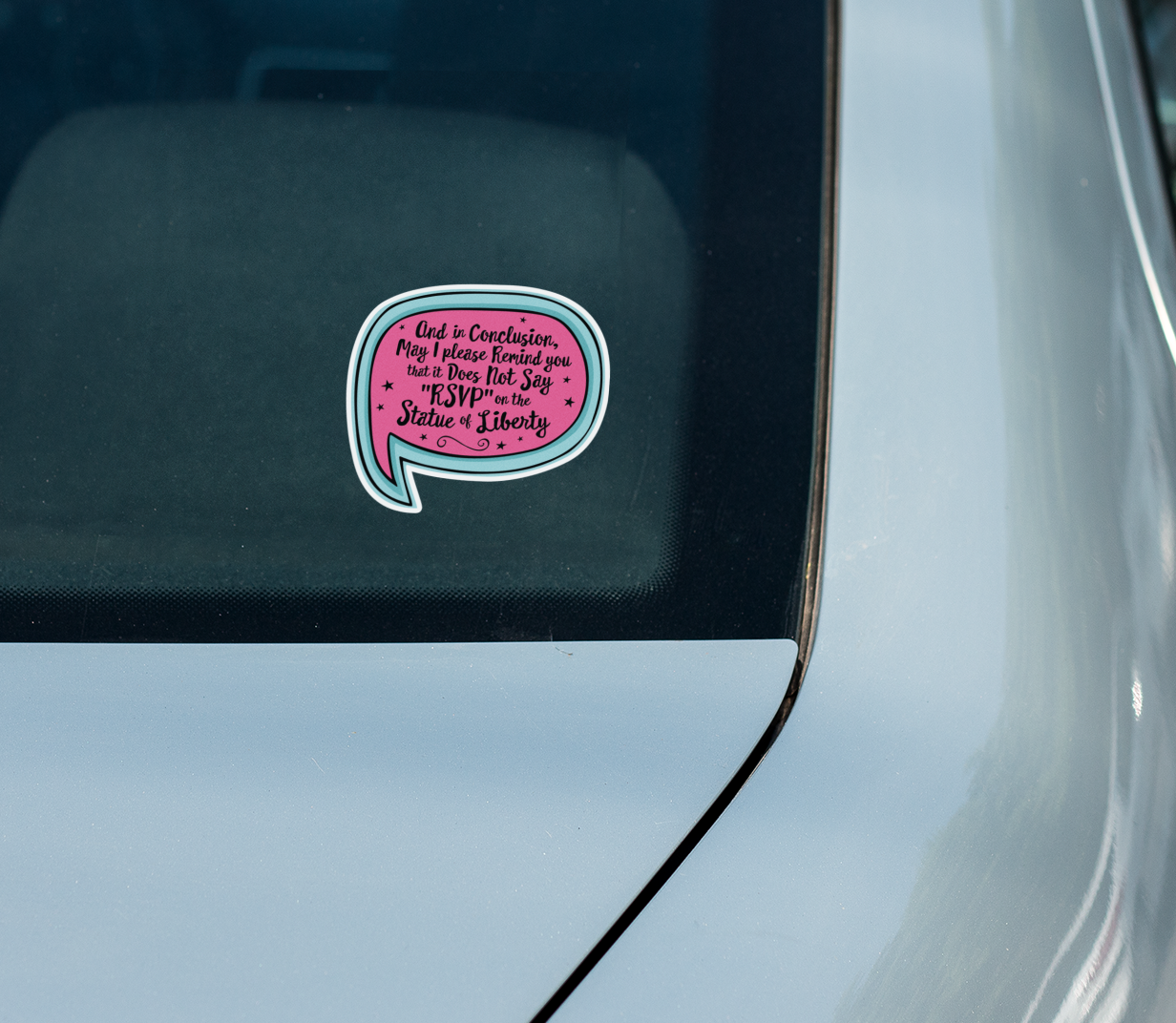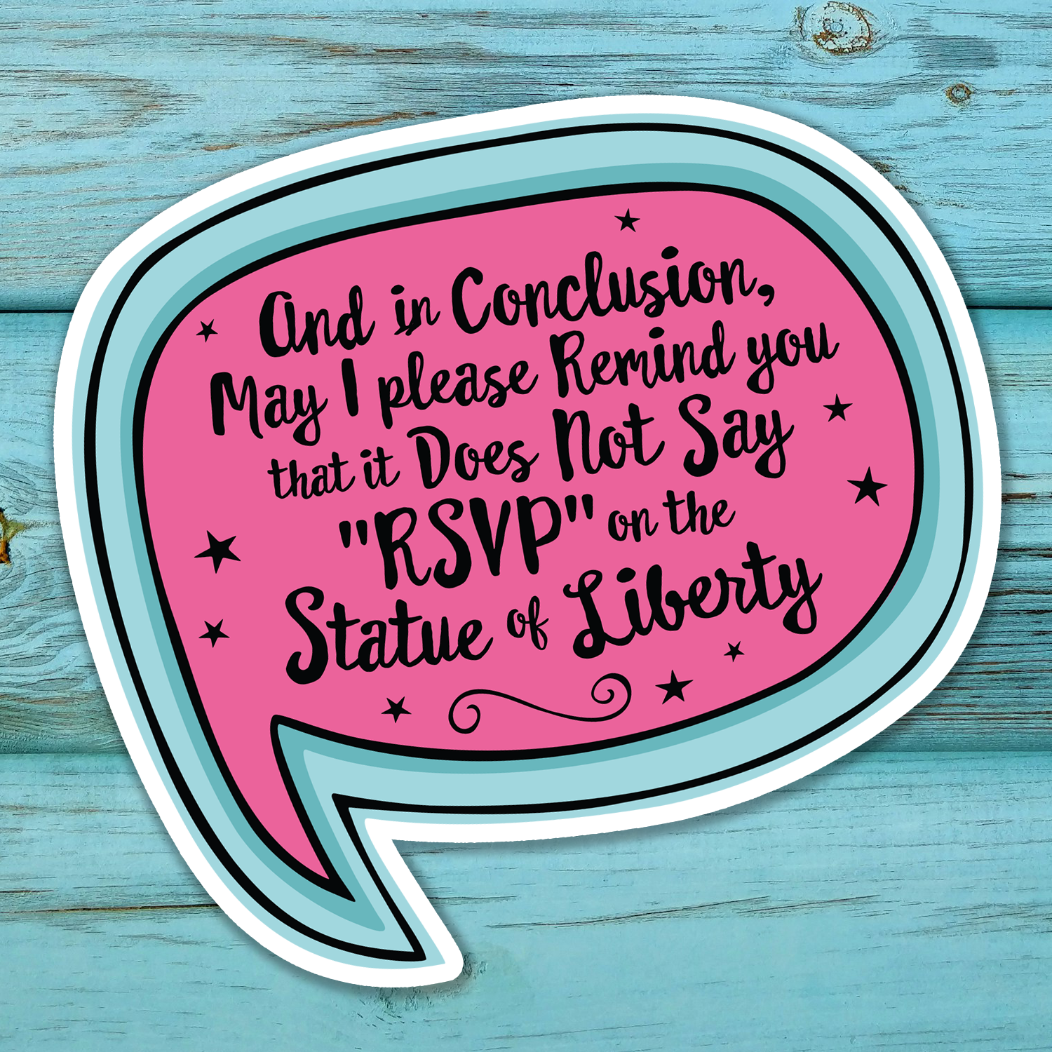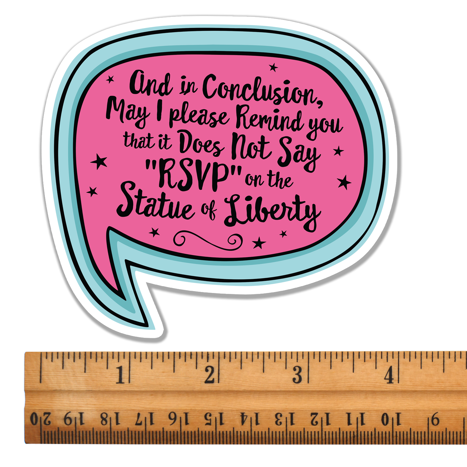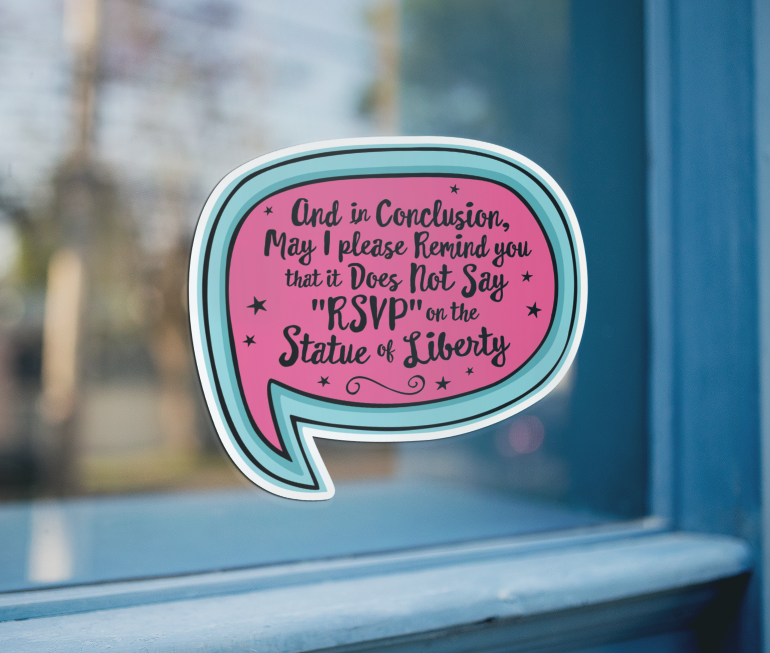 Political sticker the text "And in conclusion, may I remind you that it does not say RSVP on the Statue of Liberty." In these stressful and uncertain times, we need to subtly (or not so subtly) make our stance known and show support for those affected by the current situation. The perfect stickers to slap on your car or bring to hand out at the next rally, protest, march, or parade.