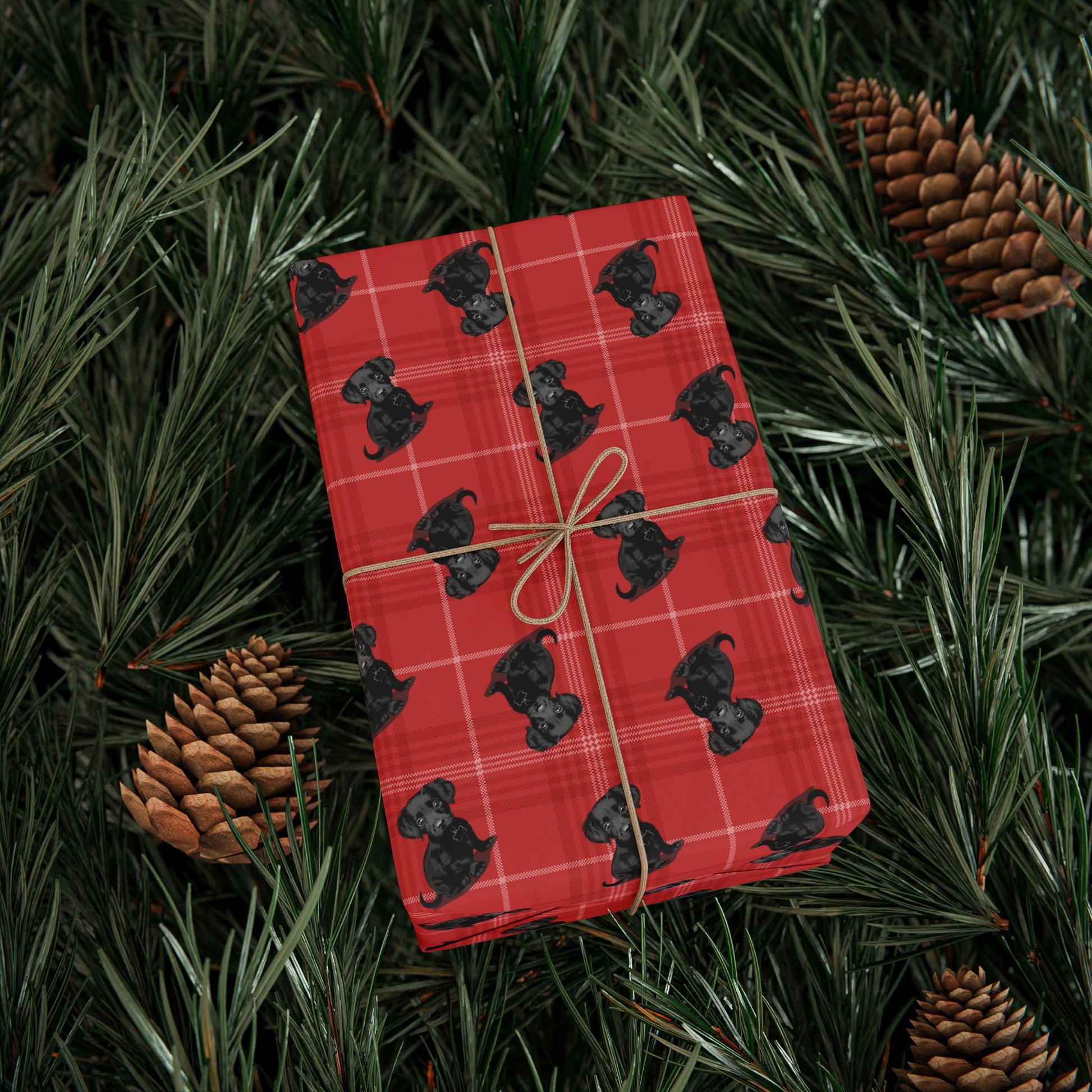 Black Chiweenie Puppy Dog Wrapping Paper, Red Plaid Dogs Print Gift Wrap Roll, Christmas Holiday Birthday Matte Wrapping Papers