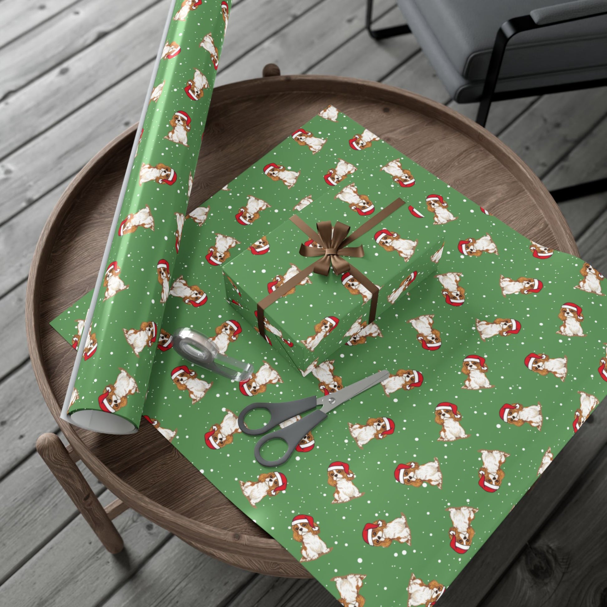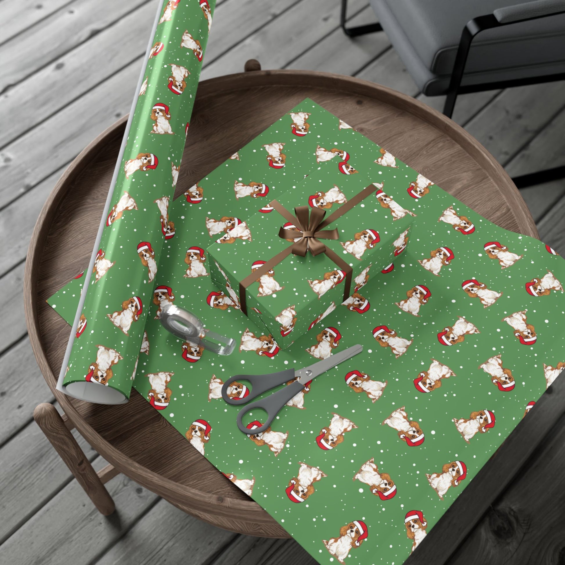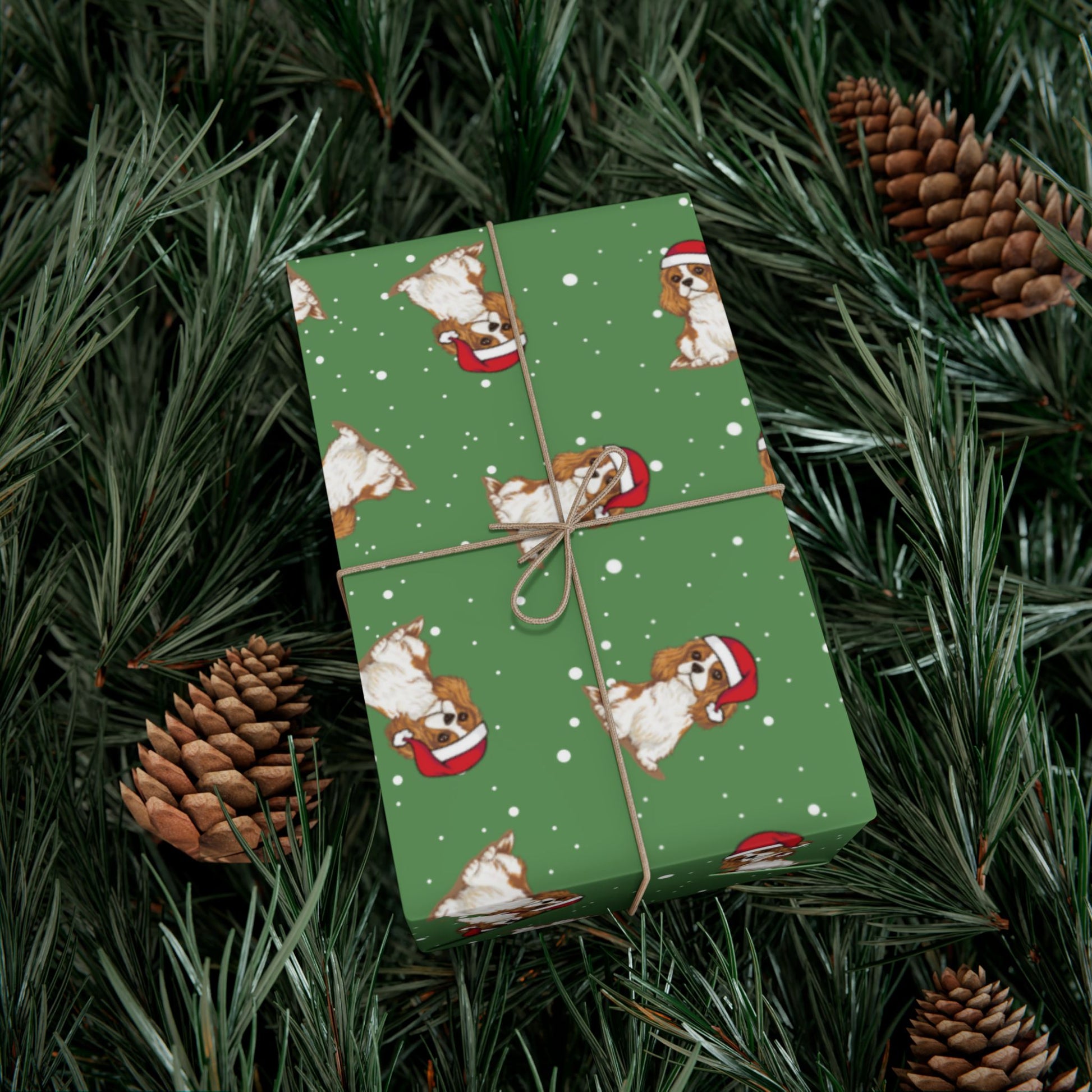 Festive green holiday Christmas wrapping paper featuring a cute Blenheim chestnut brown and white Cavalier King Charles Spaniel pattern print, perfect for adding a touch of whimsy and cheer to your gift-giving. Satin finish Cavalier King Charles Spaniel gift wrap is ideal for those who love animal designs and want to create a festive atmosphere during the holiday season. Relevant for Christmas, winter celebrations, and holiday gift-giving occasions. Product features - Satin finish wrapping paper. The perfect holiday wrapping paper to wrap Christmas gifts for your Cavalier King Charles Spaniel owner friends and family.