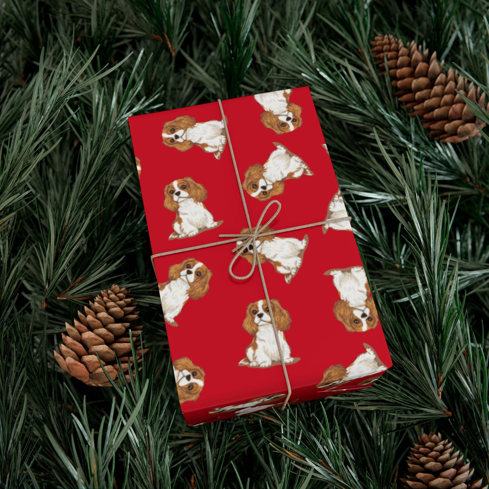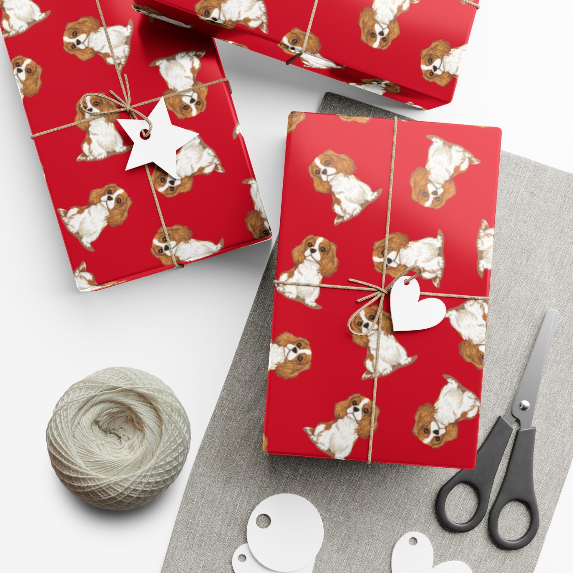 Blenheim Cavalier King Charles Spaniel Dog Wrapping Paper, Dogs Print, Red Gift Wrap, Birthday Holiday Anniversary Christmas