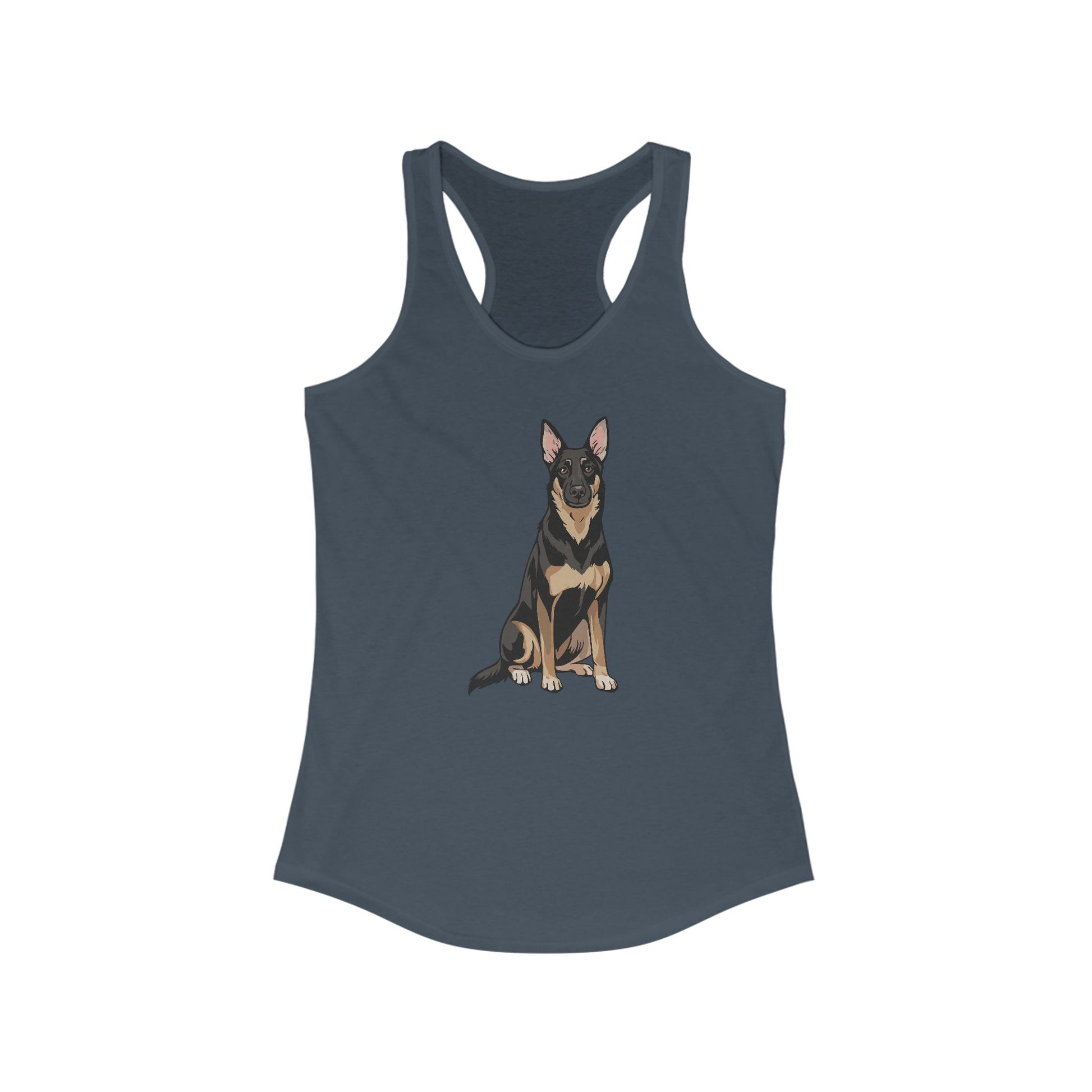 This Women's Ideal Racerback Tank is a sleeveless shirt featuring a German Shepherd dog print, giving off a sporty and stylish vibe. It is perfect for active women looking for a lightweight and comfortable option for daily wear or workouts. The tank is relevant for dog lovers and can be a great choice for casual wear, gym sessions, or outdoor activities.