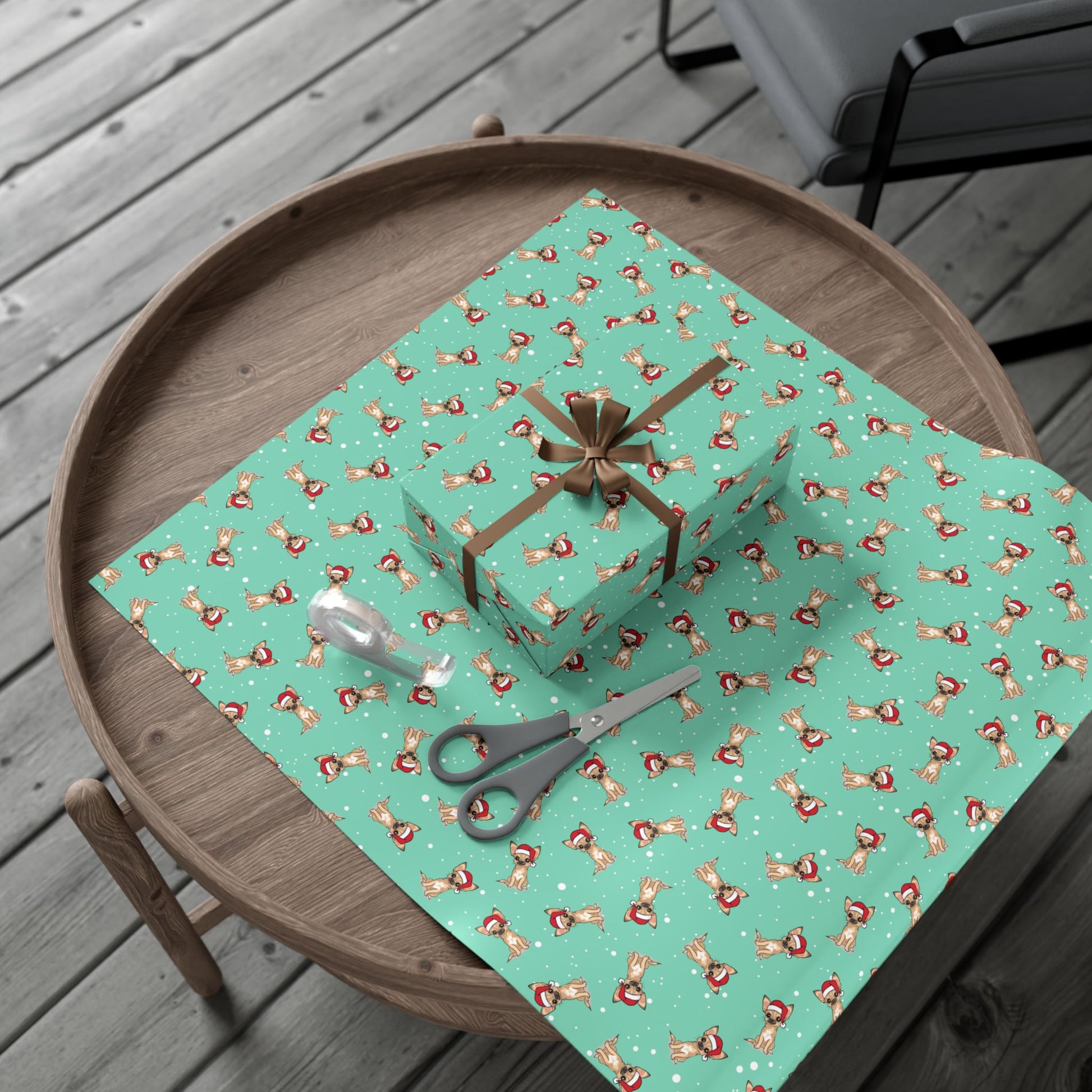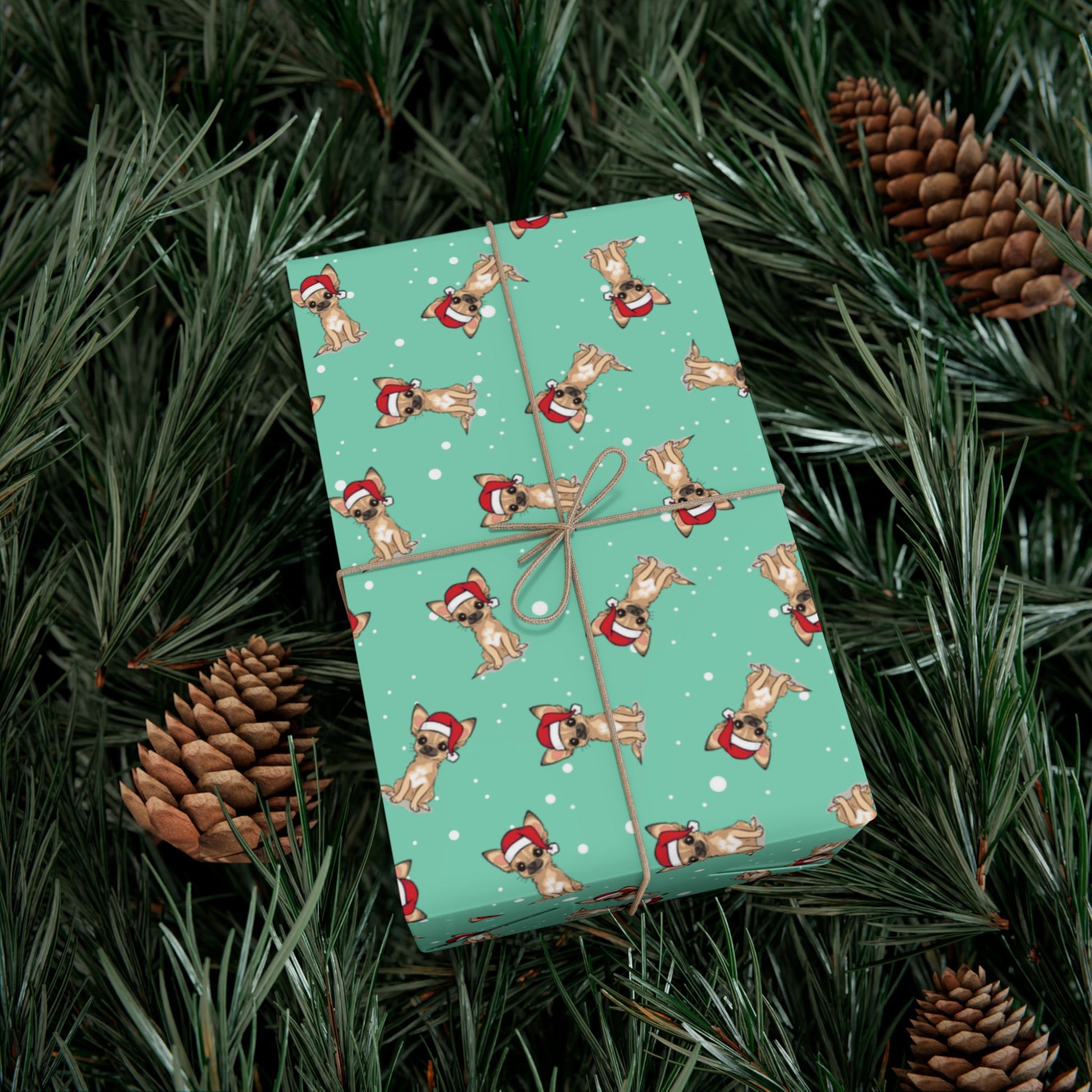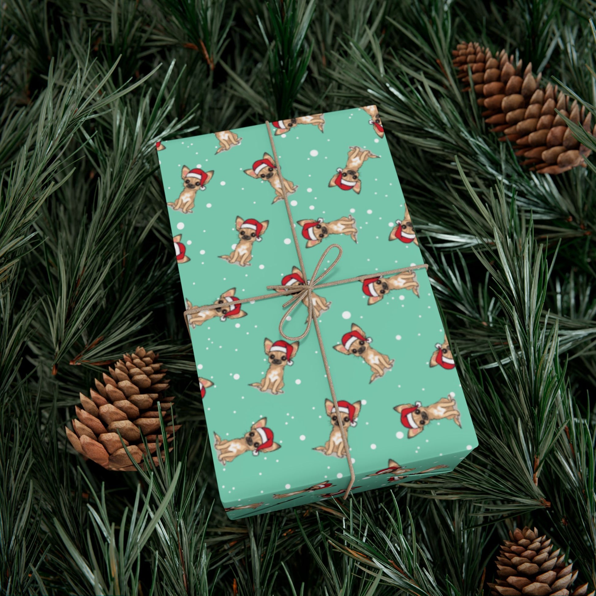 Festive holiday Christmas wrapping paper featuring a cute chihuahua puppy dog in a Santa hat pattern print, perfect for adding a touch of whimsy and cheer to your gift-giving. Satin finish chihuahua gift wrap is ideal for those who love animal designs and want to create a festive atmosphere during the holiday season. Relevant for Christmas, winter celebrations, and holiday gift-giving occasions. Product features - Satin finish wrapping paper. The perfect holiday wrapping paper to wrap Christmas gifts for your chihuahua owner friends and family.