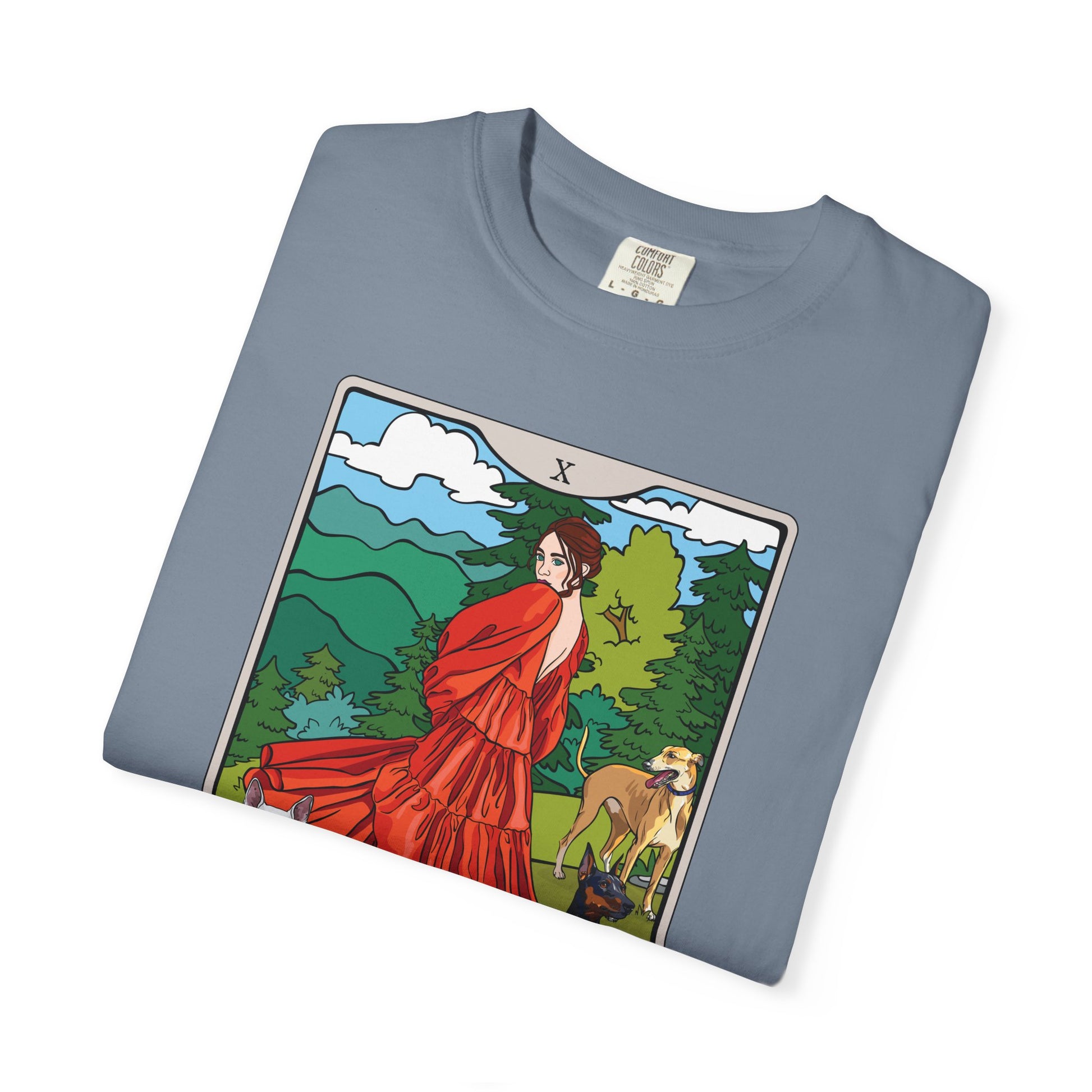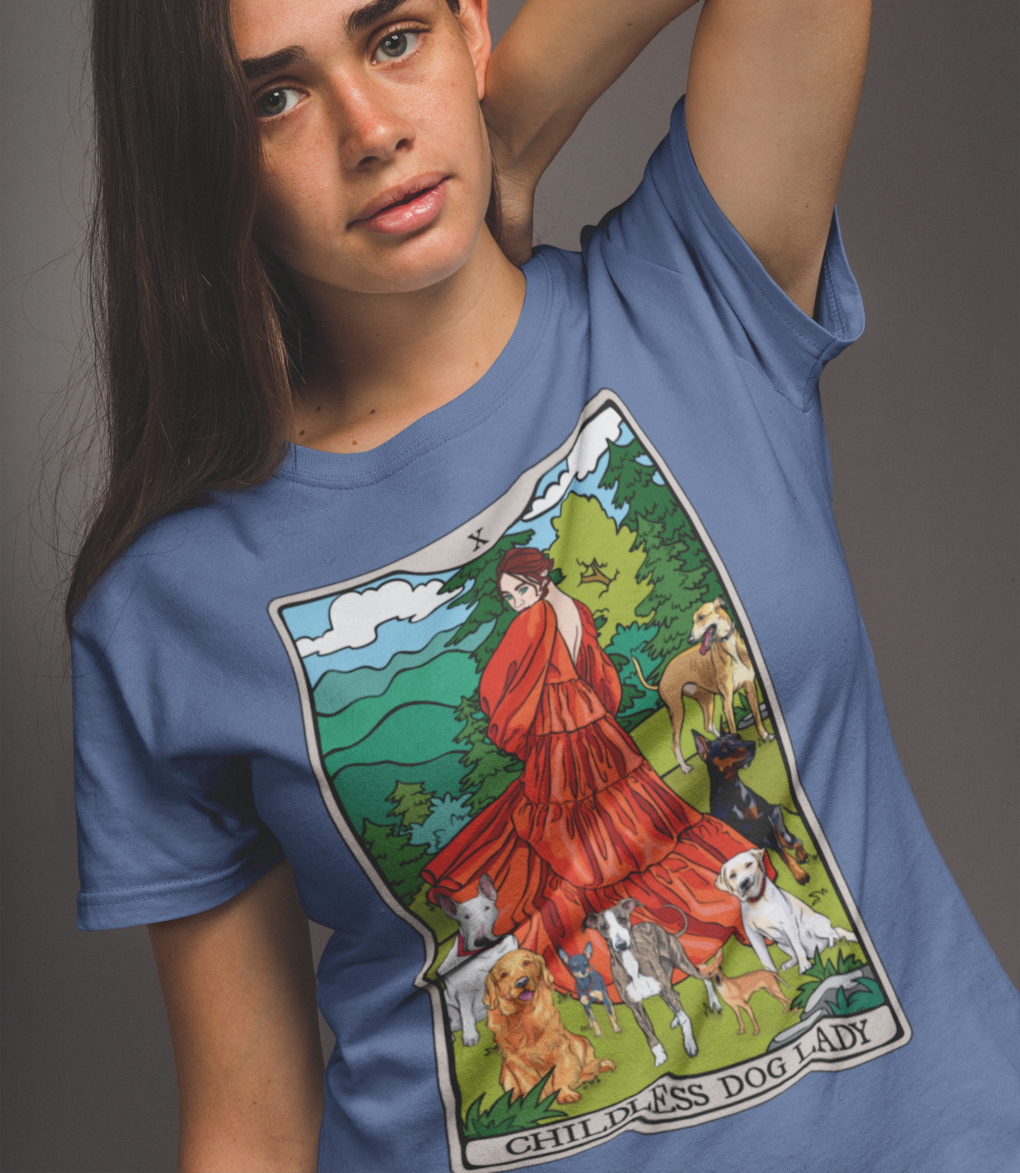 Childless Dog Lady Tarot Card Cotton T-shirt Child-Free Dog Mom Tee with Woman and Dogs Design Garment Dyed Tee