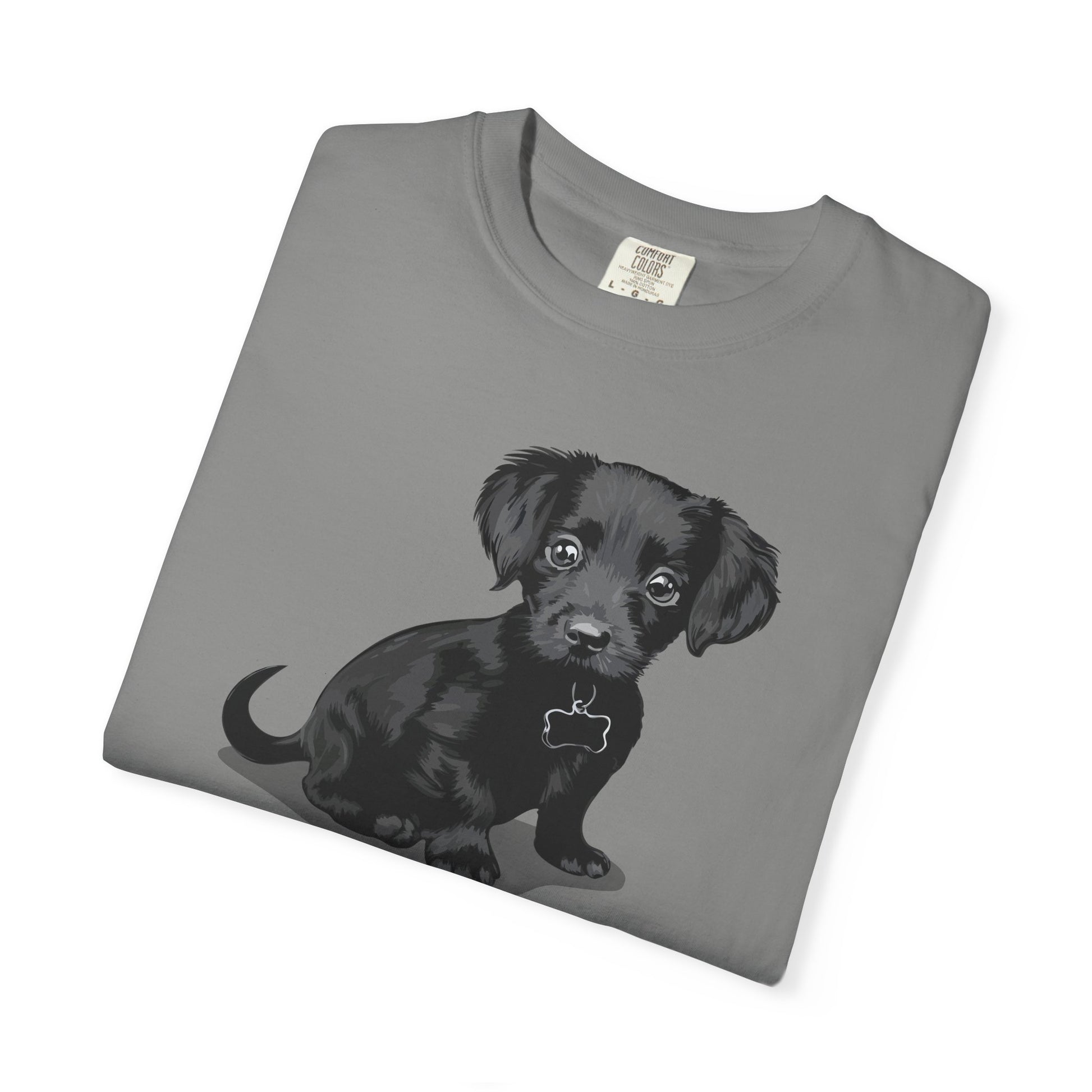 A comfortable and stylish t-shirt featuring a cute chiweenie puppy dog graphic. The artwork featured the adorable image of a chihuahua dachshund mix pup with soulful eyes and jet black fur. Perfect for dog lovers and those who enjoy a casual yet stylish look. Ideal for everyday wear, lounging, or as a unique gift for dog enthusiasts. Suitable for adults and available in multiple sizes for the perfect fit. Great for holidays, birthdays, or any occasion.
