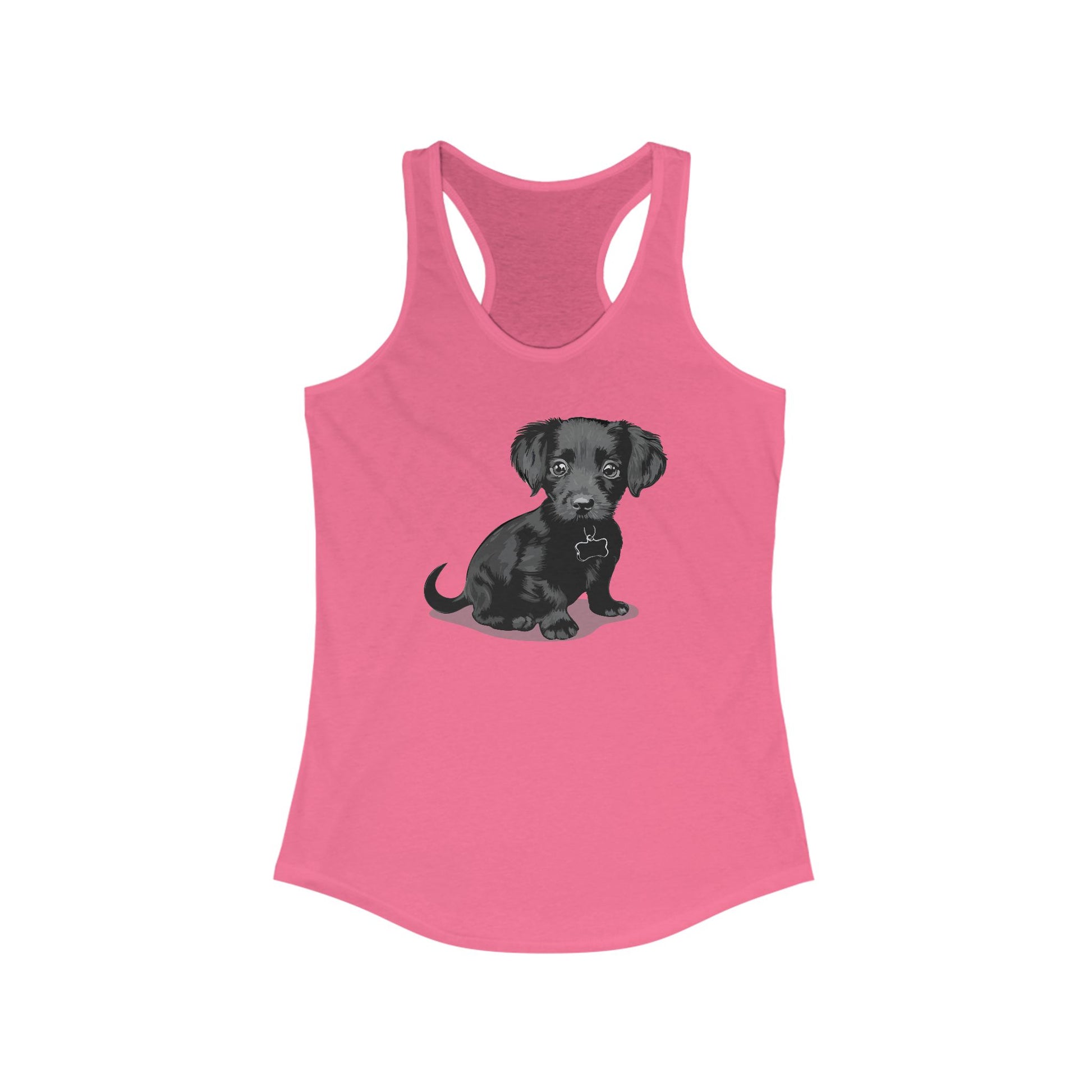 This women's racerback tank top features a black chiweenie puppy dog graphic, giving off a cute and playful vibe. The artwork featured the adorable image of a chihuahua dachshund mix pup with soulful eyes and jet black fur. Perfect for casual wear or as a workout top. Ideal for dog lovers and pet owners. Relevant for everyday wear, dog-themed events, pet appreciation days, and casual outings. Makes a great gift for a chiweenie owner or dog lover!