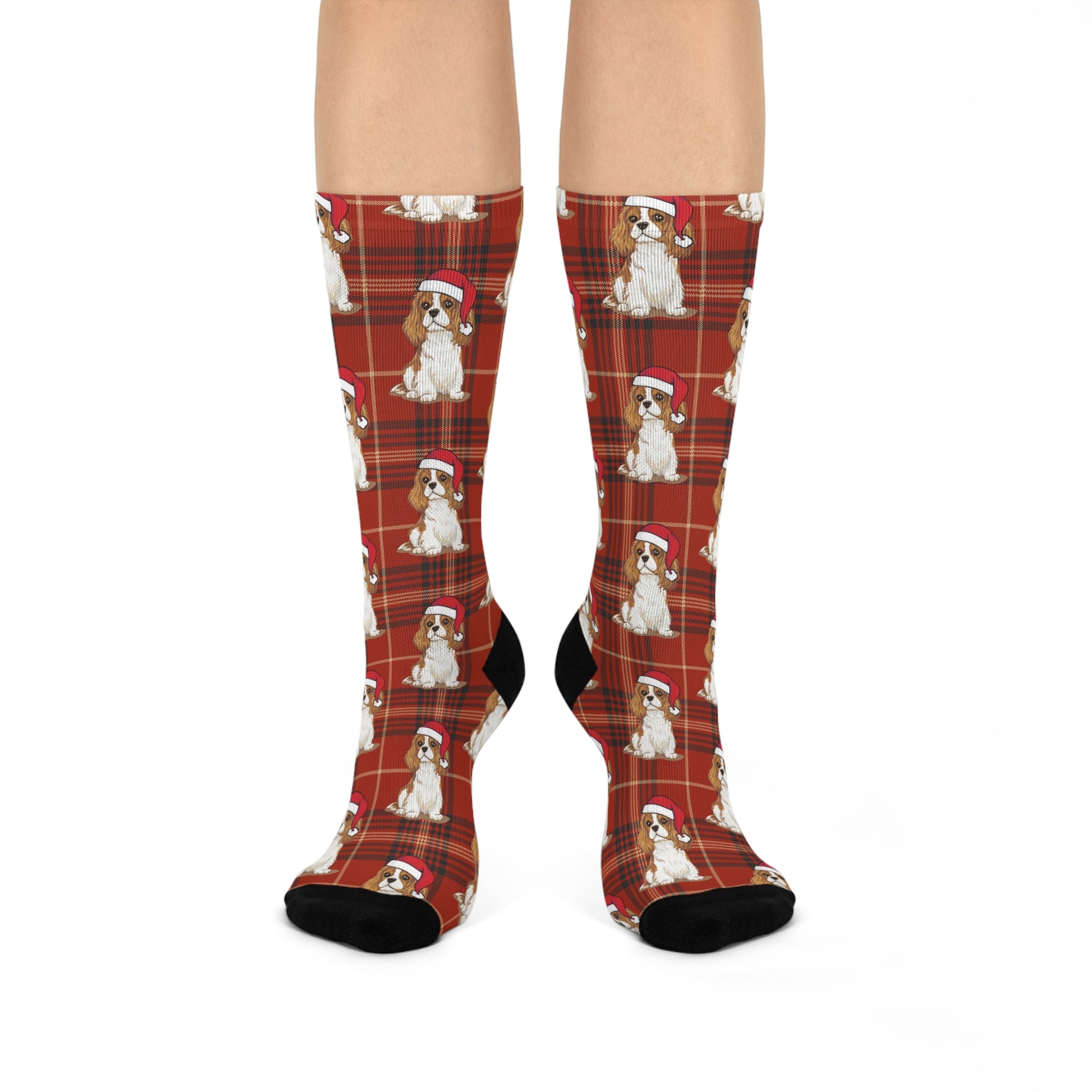 Wrap your feet in cozy holiday cheer with these red plaid Cavalier King Charles Spaniel Dog cushioned crew socks. The warm red tartan background is scattered with small, sweet spaniels wearing festive Santa hats — a subtle, whimsical nod to classic Christmas style. The fabric feels smooth and stretchy against the skin, while the cushioned bottoms give gentle support for days spent walking the market, sitting by a fire, or lounging under twinkling lights. Bright, long-lasting colors keep the pattern lively through many wears. Slip them on with boots, slippers, or your favorite loungewear to add a playful seasonal touch to quiet mornings and spirited gatherings alike.